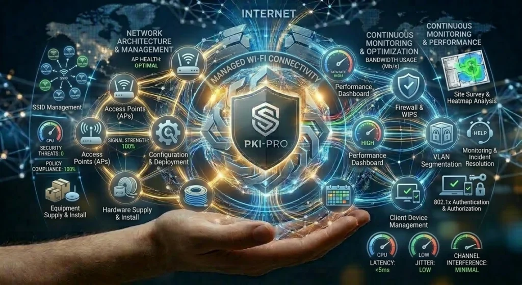 In summary, the “Managed Wi-Fi” service turns the wireless network into a reliable, secure, and high-performance business asset. The provider acts as a team of wireless networking experts who design, implement, and continuously optimize connectivity, allowing users to move and work without worrying about the quality or security of their connection.